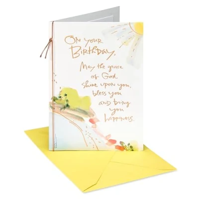 Front Message: On your birthday, may the grace of God shine upon you, bless you and bring you happiness. Inside Message: Thinking of you and wishing you a wonderful birthday This religious birthday card by American Greetings features abstract designs with copper foils. This card measures 6.75 in. x 4.625 in. Envelope is included. American Greetings offers exceptional greeting cards, gift wrap and celebration products so you can connect in ways that fit your personality and authentic style.