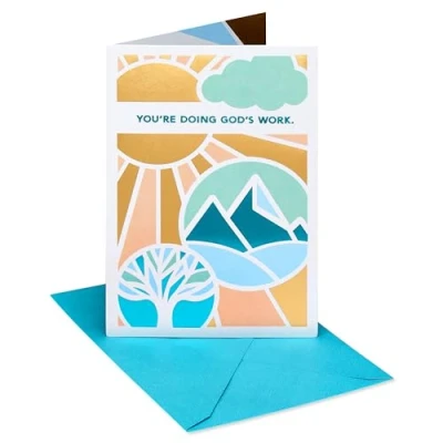 Front Message: You’re doing God’s work. Inside Message: Bless you with blessings of heaven above… Genesis 49:25 Thanks for being so amazing! This religious thank you card by American Greetings includes a thoughtful message of appreciation and features bright design with gold and aqua foils to compliment. This card measures 6.75 in. x 4.625 in. Blue envelope is included. Perfect to share gratitude with a Pastor, Priest, Reverend or Minister on Clergy Appreciation Day, first Communion, confirmation, baptism, wedding or any special occasion