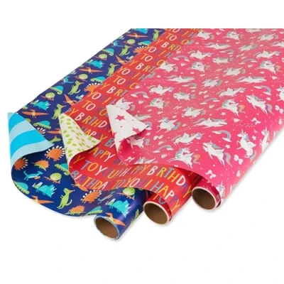 American Greetings Reversible Birthday Wrapping Paper for Kids, Dinosaurs and Unicorns (3 Rolls, 120 sq. ft)