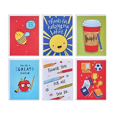 Includes 48 assorted cards (6 unique designs, 8 cards of each design) and 48 white envelopes This set of thank you greeting cards for teachers features bright and celebratory artwork on each cover to inspire you to write a personal thank you message on the blank space inside each card. Assorted thank you greeting cards are perfect for teachers, classmates, and any special person in your life These cards measure 4.375 in. x 5.9375 in. and come in corrugated packaging. These beautiful cards are perfect for anyone, including a friend, co-worker, neighbor, boyfriend, girlfriend, husband, wife, mom, dad, daughter, son, grandma, grandpa, grandson, granddaughter, aunt, uncle, cousin and more.