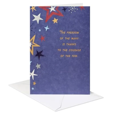 Front Message: The freedom of the many is thanks to the courage of the few. Inside Message: Thinking of you with great respect and gratitude. This thank you greeting card by American Greetings features silver and gold foil. This card measures 6.75 in. x 4.625 in. White envelope is included. Perfect for writing thank-you messages for birthday parties, elementary graduations, teacher appreciation and more
