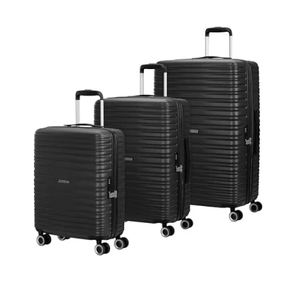 American Tourister Aerotech 3 Piece Hard Shell Suitcase Set (Carry on, Medium, Large), Expandable, Trolley with TSA Lock Black (Metallic Black)