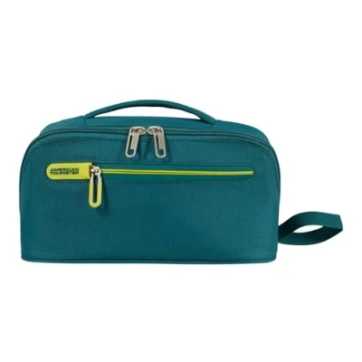 SPACIOUS ORGANISATION — The American Tourister Cloudrider features two main compartments divided by a zipper pocket, allowing you to neatly separate your shampoo, shower gel, and smaller travel essentials for easy access. PRACTICAL FEATURES — Equipped with multiple storage options including additional zipper pockets and elastic loops, this washbag ensures all your personal care items remain securely in place during your journey. ROBUST CONSTRUCTION — Featuring reinforced edges and a sturdy, stand-up design, this toiletry bag provides excellent stability in the bathroom and protects your belongings from bumps and drops while you are on the move. VERSATILE CARRYING — Designed with a convenient top handle and an additional side hand strap, you can easily transport or hang the bag in your hotel bathroom, providing maximum flexibility and comfort for every trip. MODERN DESIGN — The Cloudrider washbag comes in a stylish Misty Teal colour with vibrant neon yellow accents, making it a functional and aesthetic accessory for both men and women on their travels.