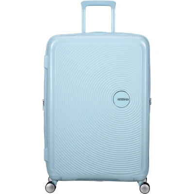 Offering over 100 litres of volume and weighing only 4.2kg, this award-winning large suitcase from our groovy Soundbox collection is secure, resistant and light! The playful circular design with contrasting matte and shiny surfaces will really cause a stir whenever you travel. Expandability, fixed TSA lock, 4 smooth rolling double wheels and handy inside organisation all help to make this a first rate suitcase choice! N.B. Make sure you are aware of airline size and weight restrictions for hold luggage. Model: Spinner (4 wheels), Colour: Pastel Blue, Material: 100% Polypropylene, Height: 77.00x51.50x29.50cm, Weight: 4.20kg, Volume: 97/110 L, Warranty: Limited 3 year global warranty