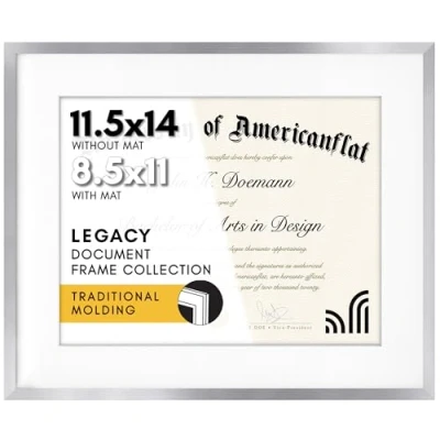 Ideal Size and Durable Material: Proudly display your diplomas, certificates or documents with this 11.5x14 frame in silver, featuring a slim molding, crafted from durable and high quality PVC material, ideal for showcasing your accomplishments. Versatile Display: These degree frames include hanging hardware for wall display, in both horizontal or vertical formats. Fits 11.5x14 documents without mat or 8.5x11 with included mat. The actual mat area is 8x10.5 inches. Timeless Design: With their elegant, modern design and thin border, our certificate frames beautifully highlight your academic or professional achievements, adding a stylish touch to any decor and bringing your milestones into the spotlight. Built to Last: This diploma frame features a shatter-resistant glass front for clarity and protection, a sturdy backboard for secure placement, and easy-to-use turn points, ensuring your important diplomas are framed for years to come. Experience the Difference: Americanflat is your trusted choice for quality frames and home decor. Our elevated craftsmanship and protective packaging ensures a hassle-free arrival.