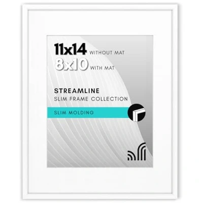 Americanflat 11x14 Picture Frame in White Thin Border 8x10 with Mat or Without Shatter Resistant Glass Horizontal and Vertical Formats for Wall