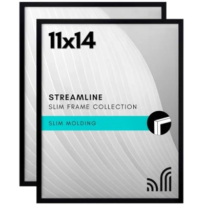 Set of 2 Picture Frames: These 11x14 frames feature a slim molding, crafted from durable and high quality PVC material in black, designed to beautifully display your cherished memories and favorite photos. Versatile Display: Each black frame includes hanging hardware for horizontal or vertical display on any wall. Perfect for your home or office, they provide a flexible and stylish solution that transforms any space. Timeless Design: With its sleek, modern design and thin border, our gallery-style frames enhance your photos, posters, or artwork, adding an elegant touch to any decor and showcasing what matters most. Built to Last: The photo frames feature a shatter-resistant glass front for clarity and protection, a sturdy backboard for secure placement, and easy-to-use turn points, ensuring your favorite moments are framed for years to come. Experience the Difference: Americanflat is your trusted choice for quality frames and home decor. Our elevated craftsmanship and protective packaging ensures a hassle-free arrival.