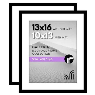 Set of 2 Picture Frames: This 13x16 frame features a sleek molding, crafted from durable and high-quality material in a black finish, designed to showcase your cherished memories and favorite photos. Easy Installation and Versatility: Hang this black frame vertically or horizontally with the included hanging hardware. Fits 13x16 photos without mat or use with included mat for 10x13 display. The actual mat area is 9.5x12.5 inches. Timeless Design: The picture frame set offers a classic design and border, seamlessly blending into any home or office decor. Its polished finish enhances your photos, posters, or artwork, adding a touch of style to your space. Built to Last: This set of frames can be used as gallery wall collage picture frames. They feature a polished plexiglass front, sturdy backboard for picture placement, and easy-to-open turn buttons for photo loading and updates. Experience the Difference: Americanflat is your trusted choice for quality frames and home decor. Our elevated craftsmanship and protective packaging ensures a hassle-free arrival.