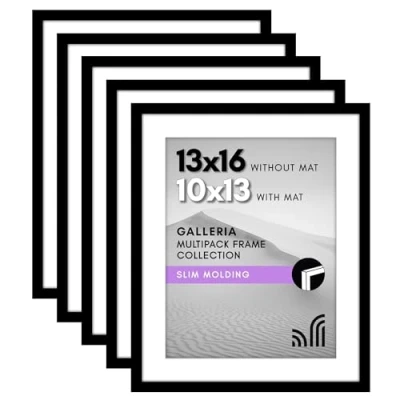 Set of 5 Picture Frames: This 13x16 frame features a sleek molding, crafted from durable PVC in a black finish, designed to showcase your cherished memories and favorite photos. Easy Installation and Versatility: Hang this black frame vertically or horizontally with the included hanging hardware. Fits 13x16 photos without mat or use with included mat for 10x13 display. The actual mat area is 9.5x12.5 inches. Timeless Design: The picture frame set offers a classic design and border, seamlessly blending into any home or office decor. Its polished finish enhances your photos, posters, or artwork, adding a touch of style to your space. Premium Quality and Protection: This set of frames can be used as gallery wall collage picture frames. They feature a polished plexiglass front, sturdy backboard for picture placement, and easy-to-open turn buttons for photo loading and updates. Experience the Difference: Americanflat is your trusted choice for quality frames and home decor. Our elevated craftsmanship and protective packaging ensures a hassle-free arrival.