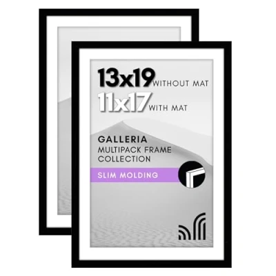 Set of 2 Picture Frames: This 13x19 frame features a sleek molding, crafted from durable PVC in a black finish, designed to showcase your cherished memories and favorite photos. Easy Installation and Versatility: Hang this black frame vertically or horizontally with the included hanging hardware. Fits 13x19 photos without mat or use with included mat for 11x17 display. The actual mat area is 10.5x16.5 inches. Timeless Design: The picture frame set offers a classic design and border, seamlessly blending into any home or office decor. Its polished finish enhances your photos, posters, or artwork, adding a touch of style to your space. Premium Quality and Protection: This set of frames can be used as gallery wall collage picture frames. They feature a polished plexiglass front, sturdy backboard for picture placement, and easy-to-open turn buttons for photo loading and updates. Experience the Difference: Americanflat is your trusted choice for quality frames and home decor. Our elevated craftsmanship and protective packaging ensures a hassle-free arrival.