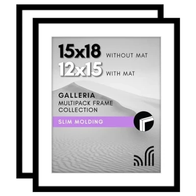 Set of 2 Picture Frames: This 15x18 frame features a sleek molding, crafted from durable and high-quality material in a black finish, designed to showcase your cherished memories and favorite photos. Easy Installation and Versatility: Hang this black frame vertically or horizontally with the included hanging hardware. Fits 15x18 photos without mat or use with included mat for 12x15 display. The actual mat area is 11.5x14.5 inches. Timeless Design: The picture frame set offers a classic design and border, seamlessly blending into any home or office decor. Its polished finish enhances your photos, posters, or artwork, adding a touch of style to your space. Premium Quality and Protection: This set of frames can be used as gallery wall collage picture frames. They feature a polished plexiglass front, sturdy backboard for picture placement, and easy-to-open turn buttons for photo loading and updates. Experience the Difference: Americanflat is your trusted choice for quality frames and home decor. Our elevated craftsmanship and protective packaging ensures a hassle-free arrival.