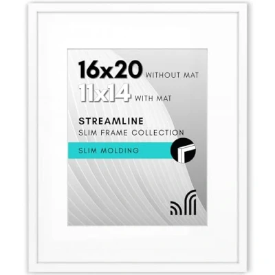 IDEAL SIZE & DURABLE MATERIAL This 16x20 frame features a slim shape that is made of durable and high quality PVC material in white to beautifully display your cherished memories and favorite photos. MULTI PURPOSE These white picture frames include hanging fasteners for horizontal or vertical display on any wall. Fits 16 x 20 inch photos without mount or 11 x 14 inches. The actual mat area is 10.5 x 13.5 inches. Timeless design. With its sleek, modern design and thin border, our gallery frame enhances your photos, posters or artwork, adds an elegant touch to any decor and shows what matters most. DURABLE This picture frame features a polished plexiglass front for clarity and protection, a sturdy backboard for secure placement, and easy-to-use turning points to keep your favorite moments framed for years to come. Experience the difference. Americanflat is your trusted choice for high-quality frames and home decor. Our increased craftsmanship and protective packaging ensure a hassle-free arrival.