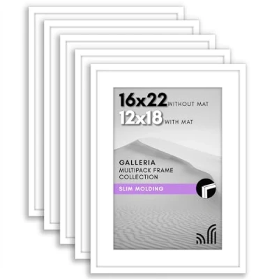 Set of 5 Frames for Gallery Wall: Complete your gallery wall with this set of five sleek white picture frames. Each 16x22 frame is crafted from high-quality materials and features a modern design that complements any decor. Versatile Display Options: Use these collage picture frames for wall to frame 16x22 photos without mat or use this 12x18 frame with the included mat. Each wall picture frame has an actual mat opening size of 11.5x17.5 inches. High-Quality Materials: Our gallery-style frames are expertly constructed using PVC molding. It has a plexiglass front, providing a clear view of your photos. Each photo frame also has a sturdy backboard, ensuring a secure placement for your photos. Load Your Photos With Ease: Utilize our user-friendly turn buttons located at the back of our photo frames. With these easy-to-open buttons, inserting and updating photos becomes a simple and swift process, enabling you to update and enhance your display. Easy to Hang: Our plastic picture frames set is designed with lightweight construction and comes with built-in hanging hardware, ensuring quick and effortless installation on your walls in either horizontal or vertical format.