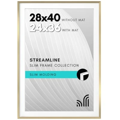 Americanflat 28x40 Poster Frame With Polished Plexiglass Use as 24x36 Mat or Without Streamline Collection Thin Photo Display for Wall Gold