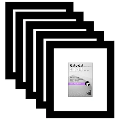 Set of 5 Gallery Wall Frame Set: Complete your gallery wall with this set of five sleek black picture frames. Each 5.5x6.5 frame is crafted from high-quality materials and features a modern design that complements any decor. Versatile Display Options: Use these collage picture frames for wall to frame 5.5x6.5 photos without mat or use this 2.5x3.5 frame with mat. Each wall picture frame has an actual mat opening size of 2x3 inches and suitable for wall or tabletop display. High-Quality Materials: Our gallery-style frames are expertly constructed using PVC molding. It has a plexiglass front, providing a clear view of your photos. Each photo frame also has a sturdy backboard, ensuring a secure placement for your photos. Load Your Photos With Ease: Utilize our user-friendly turn buttons located at the back of our photo frames. With these easy-to-open buttons, inserting and updating photos becomes a simple and swift process, enabling you to update and enhance your display. Easy to Hang: Our plastic picture frames set is designed with lightweight construction and comes with built-in hanging hardware, ensuring quick and effortless installation on your walls in either horizontal or vertical format.