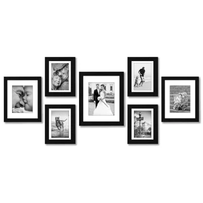 Set of 7 Picture Frames: This picture frame set is crafted from durable engineered wood (MDF) moulding with a woodgrain effect in black, designed to showcase your cherished memories and favourite photos. Versatile Display: Frame set includes one 11x14 frame, two 8x10 frames, and four 5x7 frames, with mounts for 4x6, 5x7 and 8x10 photos. Includes hanging hardware for wall display, and the 8x10 and 5x7 frames come with easel stands for tabletop use. Timeless Design: The gallery wall frame set offers a classic design and border, seamlessly blending into any home or office decor. Its polished finish enhances your photos, posters, or artwork, adding a touch of style to your space. Premium Quality: With a shatter-resistant glass front for clarity and protection, these collage picture frames feature a sturdy backboard for secure photo placement and easy metal tab closures for photo loading and updates. Experience the Difference: Americanflat is your trusted choice for quality frames and home decor. Our elevated craftsmanship and protective packaging ensure a hassle-free arrival.