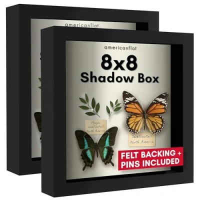 2 Pack Glass Display Case : These black 20.3x20.3 cm shadow box frames have an interior depth of 3.8 cm allowing you to store and display all kinds of 3D objects and keepsakes. Use the linen-backed pin board or place objects in the shadowbox for display. Material: Wood shadow box frame with a polished tempered shatter-resistant glass front; preserves your photos, cards and memories. Quality: Durable shadow box frame with a clear tempered shatter-resistant glass front; this versatile shadow box frame can also be used as a normal frame if the inside pieces of wood are removed so the glass front lays flat against the linen backing. Use and Display: Use the 6 included push pins to display your memorabilia against the linen backing; hang the shadow box on any wall or display it on tabletop, no easel necessary. Protective Packaging: Americanflat developed exclusive proprietary packaging that helps ensure safe delivery of fragile items; order with confidence, click and add to cart today!