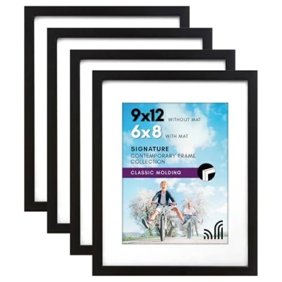 Set of 4 Picture Frames: This 9x12 frame features a sleek molding, crafted from durable engineered wood (MDF) material in a black finish, designed to showcase your cherished memories and favorite photos. Custom Mat and Versatility: Hang this black frame vertically or horizontally with the included hanging hardware and an easel stand. Fits 9x12 photos without mat or use with included mat for 6x8 display. The actual mat area is 5.5x7.5 inches. Timeless Design: The gallery wall frame set offers a classic design and border, seamlessly blending into any home or office decor. Its polished finish enhances your photos, posters, or artwork, adding a touch of style to your space. Premium Quality and Protection: This set of frames can be used as gallery wall collage picture frames. They feature a shatter-resistant glass front, sturdy backboard for picture placement and metal tab closures for photo loading and updates. Experience the Difference: Americanflat is your trusted choice for quality frames and home decor. Our elevated craftsmanship and protective packaging ensures a hassle-free arrival.
