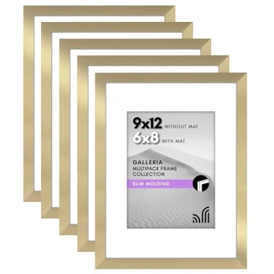 Set of 5 Picture Frames: This 9x12 frame features a sleek molding, crafted from durable PVC in a gold finish, designed to showcase your cherished memories and favorite photos. Easy Installation and Versatility: Hang this gold frame vertically or horizontally with the included hanging hardware. Fits 9x12 photos without mat or use with included mat for 6x8 display. The actual mat area is 5.5x7.5 inches. Timeless Design: The picture frame set offers a classic design and border, seamlessly blending into any home or office decor. Its polished finish enhances your photos, posters, or artwork, adding a touch of style to your space. Built to Last: This set of frames can be used as gallery wall collage picture frames. They feature a polished plexiglass front, sturdy backboard for picture placement, and easy-to-open turn buttons for photo loading and updates. Experience the Difference: Americanflat is your trusted choice for quality frames and home decor. Our elevated craftsmanship and protective packaging ensures a hassle-free arrival.