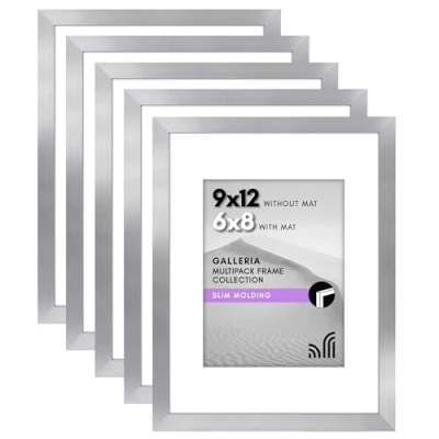 Set of 5 Picture Frames: This 9x12 frame features a sleek molding, crafted from durable PVC in a silver finish, designed to showcase your cherished memories and favorite photos. Easy Installation and Versatility: Hang this silver frame vertically or horizontally with the included hanging hardware. Fits 9x12 photos without mat or use with included mat for 6x8 display. The actual mat area is 5.5x7.5 inches. Timeless Design: The picture frame set offers a classic design and border, seamlessly blending into any home or office decor. Its polished finish enhances your photos, posters, or artwork, adding a touch of style to your space. Premium Quality and Protection: This set of frames can be used as gallery wall collage picture frames. They feature a polished plexiglass front, sturdy backboard for picture placement, and easy-to-open turn buttons for photo loading and updates. Experience the Difference: Americanflat is your trusted choice for quality frames and home decor. Our elevated craftsmanship and protective packaging ensures a hassle-free arrival.