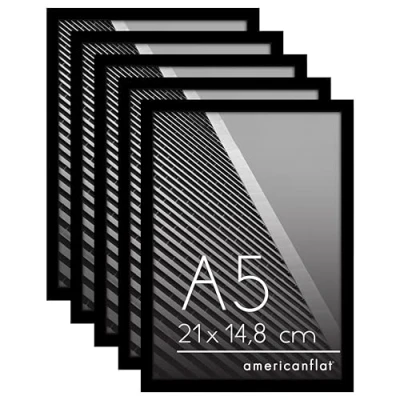 Thin Border Design: Our A5 frames, with thin mouldings, add a sleek and modern touch and are perfect for your cherished memories and favourite photos. Versatile Display: Lightweight and easy to hang, our black picture frames are crafted with durable yet lightweight plastic material. Includes hanging hardware for easy wall display and an easel for tabletop display in horizontal or vertical formats. Material and Quality: Crafted from PVC moulding, our durable gallery-style black frames feature a shatter-resistant glass front for a clear view of your photos, along with a sturdy backboard that securely holds them in place. Load Photos with Ease: Simplify the process of showcasing your memories with easy-to-open turn buttons at the back of our photo frames. Inserting and updating photos becomes a breeze, allowing you to effortlessly refresh your display. Built to Last: Our picture frames are crafted with high-quality materials and meticulous attention to detail, ensuring they will remain a cherished keepsake for years to come. Invest in lasting quality with Americanflat, click "Add to Cart" now!