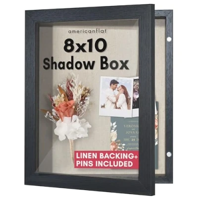 Ideal Size and Durable Material: This front opening 8x10 shadow box with a door is crafted from durable engineered wood (MDF) molding in a black finish, designed to showcase your cherished memories and favorite items. Versatile Display: The deep shadow box frame has an interior depth of 1.4 inches, offering ample space and protection for your items. Its 2.3-inch exterior depth allows for both tabletop or wall display, either horizontally and vertically. Timeless Design: This shadowbox picture frame offers a classic design and thick border, seamlessly blending into any home or office decor. Its polished finish enhances your photos, awards or other memorabilia, adding a touch of style to your space. Premium Quality: Featuring a shatter-resistant glass front, hanging hardware, MDF backboard, sturdy hinges, magnetic closure and included push pins for securing items, these shadow box frames ensure clarity, protection, and easy display. Experience the Difference: Americanflat is your trusted choice for quality frames and home decor. Our elevated craftsmanship and protective packaging ensures a hassle-free arrival.