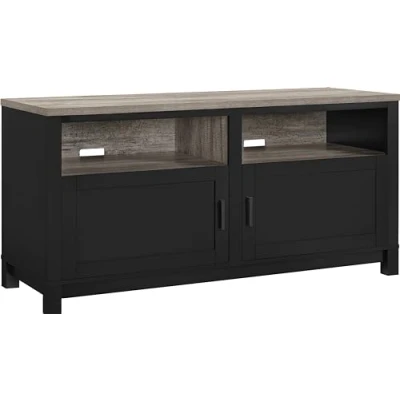 2 open shelves for media players and devices and 2 cabinets for concealed storage The unit has a soft grey finish with brown woodgrain accents and pewter door handles Made of painted MDF and laminated particleboard Product Dimensions: 68. 07 cm (H) x 135. 89 cm (W) x 50. 04 cm (D)| Weight: 42. 59 kg Shipping Dimensions: 150. 01 cm (L) x 57. 99 cm (W) x 19. 51 cm (H)| Weight: 48. 90 kg