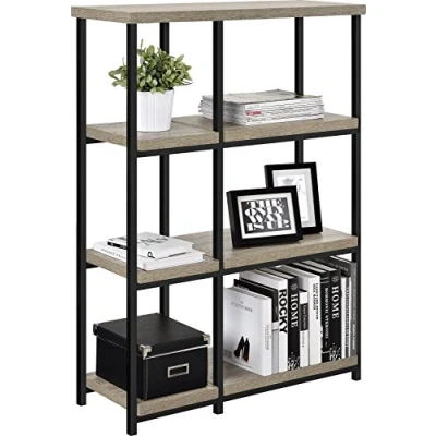 Textured light oak finish and Black metal legs Requires minimal assembly. Spacious shelves are perfect for organizing books or for displaying décor Colour/Finish - Distressed Grey Oak/Sonoma Oak