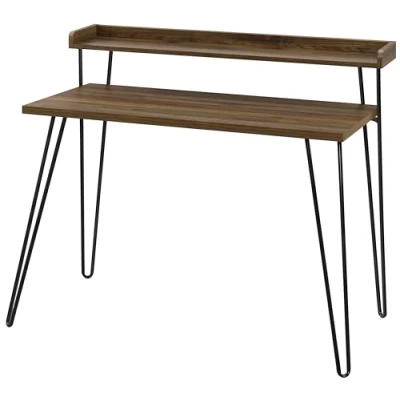 Distressed walnut desk top surfaces and metal hairpin style legs Desk Riser gives you extra space to keep office supplies Laminated particleboard with powder coated metal legs Product Dimensions: 89.92 cm (H) x 113.54 cm (W) x 60.45 cm (D)| Weight: 13.92 kg Shipping Dimensions: 115.49 cm (L) x 7.29 cm (W) x 8.99 cm (H)| Weight: 15.77 kg