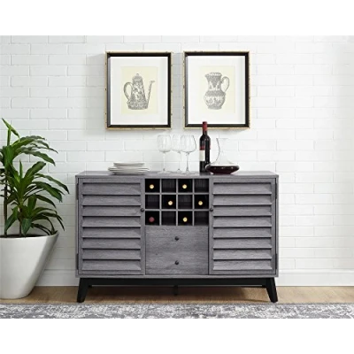 Laminated particleboard, MDF, wood veneer, solid wood with a Grey Oak finish 12 wine bottle compartments, 1 drawer for bottle openers and napkins and 2 shelves, 1 adjustable, behind each door for wine glasses Made of laminated particleboard, MDF, solid wood and wood veneers Product Dimensions: 75. 57 cm (H) x 120. 02 cm (W) x 48. 26 cm (D)| Weight: 45. 52 kg Shipping Dimensions: 133. 35 cm (L) x 57. 15 cm (W) x 26. 04 cm (H)| Weight: 51. 47 kg
