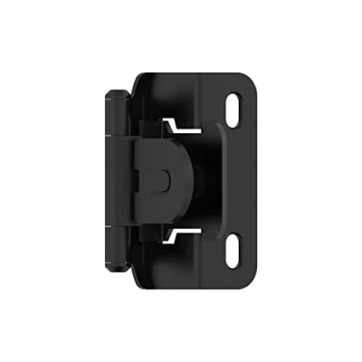 1/2 in (13 mm) Overlay Hinge this means your cabinet door "overlays", or overlaps, the cabinet frame, or base by 1/2". Please measure carefully. Heavy duty steel contruction with a decorative Matte Black finish. Made for a face frame cabinet style commonly used in kitchens and bathrooms, or on furniture. There are slotted holes on the cabinet hinge frame wing for easy adjustment. Dualspring mechanism for quiet, consistent selfclosing power. The included door bumpers soften the sound of the cabinet door snapping closed. Easy mounting hinges slip into prerouted slots on cabinet door. Built in speciallyangled clamps for reliable holding power. While we strive to accurately display colors, they may appear differently due to variations in individual monitor settings, which are beyond our control, Manufacturer: Amerock