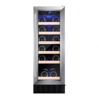 JoybuyThe Amica AWC300SS 30cm Wide Wine Cooler is a slimline, stainless steel wine fridge that fits 19 bottles and features adjustable electronic temperature control (5°C–20°C), UV-protected glass, wooden shelves, a reversible door, over-temperature alarm, and quiet 39dB operation—perfect for compact kitchens or under-counter spaces.