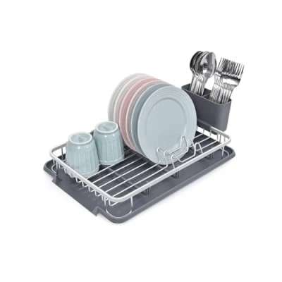 Amig Ezzik Dish Rack 41.7 x 28.7 6 cm Aluminium and Plastic Colour Grey with Drip Tray Cutlery Holder Capacity for 8 Plates, Glasses