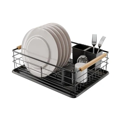 Amig Graz Dish Rack 42 x 31.5 15 cm Steel with Wooden Handle Colour Black Drip Tray and Cutlery Holder Capacity for 10 Plates 6 Glasses