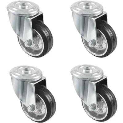 PACK 4 ROTATING WHEELS: Metal core swivel wheels with hole. Contains a black rubber band with roller bearings. It is black. FUNCTIONALITY: Ideal for moving heavy furniture, industrial equipment, transport carts, shelving etc. They are also designed with a rubber band which gives good traction and at the same time protects the floor from scratches. DETAILED TECHNICAL INFORMATION: The wheel diameter is 80 mm and can withstand a weight of up to 70 kg. The diameter of the hole is 12.5mm. UNIVERSAL: This set of 4 wheels features a 360° swivel platform, which provides stability and safety to the load. These wheels are designed for universal use on medium loads. COMMITMENT: At AMIG we have been manufacturing and distributing products of high quality and reliability of locksmiths, DIY, hardware, hardware, gardening, household and household appliances for more than 80 years, electricity, professional line and occupational protection and safety.