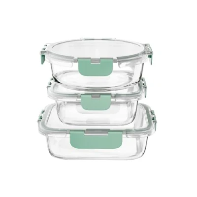 Amig Set of 3 airtight glass food containers Capacity: 400 ml / 370 320 Round, rectangular and square For microwave, oven, freezer dishwasher Green colour