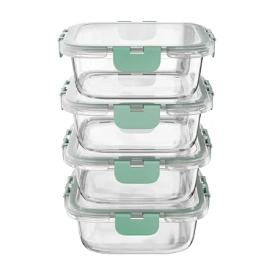 Amig Set of 4 square airtight Glass food containers Capacity: 320 ml 112 x 50 mm for microwave, oven, freezer and dishwasher Green colour