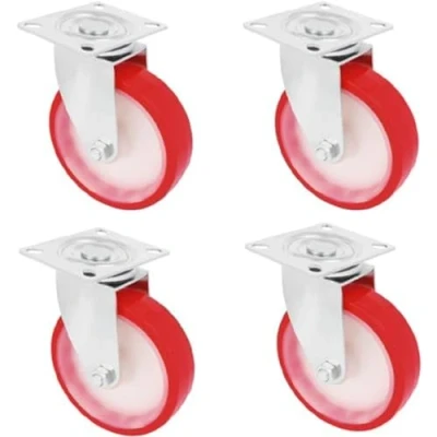 PACK OF 4 ROTATING WHEELS: Wheels with rotating metal plate. They are constructed with a red polyurethane strap. They contain a white nylon core. Functionality: Ideal for moving heavy furniture, industrial equipment, transport trolleys, shelves, etc. In addition, they are equipped with a polyurethane band that provides good grip while protecting the floor from scratches. TECHNICAL DETAILS The diameter of the wheel is 80mm and it can support a weight of up to 100kg. The dimensions of the metal plate are 100 mm x 80 mm. UNIVERSAL: This set of 4 wheels features a 360° rotating plate that provides stability and safety for the load. These wheels are designed for universal use in medium duty loads. Commitment: At AMIG, we have been manufacturing and distributing high-quality and reliable products in the field of locksmith, DIY, ironware, fittings, gardening, household, electrics, professional line as well as occupational safety and safety for over 80 years.