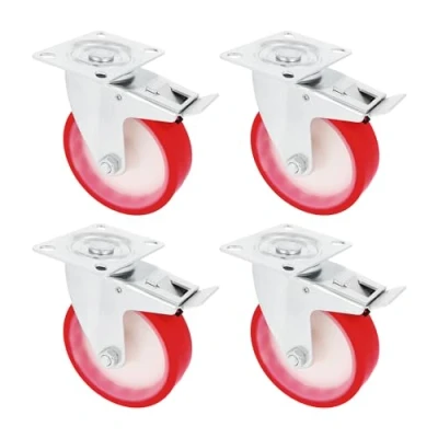 Amig Set of 4 Wheels with Brake Diameter 125 mm Swivel Metal Plate Maximum Weight 170 kg for Moving Heavy Furniture Roller Bearings White Nylon Core Red Polyurethane