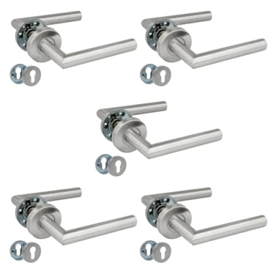 HANDLE SET ON ROSE WITH KEYHOLE COVER: Set of 5 two handles on rose with a euro-profile cylinder keyhole cover, featuring a comfortable lever that fits the hand and does not slip. DETAILS: Dimensions: 136 x Ø19 mm. Rose: 53 mm. Made of stainless steel, a metal known for its resistance to rust, corrosion, and excellent durability. USES: Handles with latch, perfect for both interior and exterior doors. Ideal for entry doors, offices, and any room in the home. Its modern design and silver finish make it adaptable to most interior styles. EASY TO INSTALL: Thanks to the included installation accessories, this handle is very easy to install on any wooden door. You’ll only need a drill to screw it in. COMMITMENT: With nearly 10,000 products available, at AMIG we have over 80 years of experience manufacturing and distributing locksmithing, DIY, hardware, fittings, gardening, household, electrical products, professional tools, and workplace safety equipment, all of the highest quality and reliability., Weight: 0.9700339528 Pounds, Manufacturer: Amig