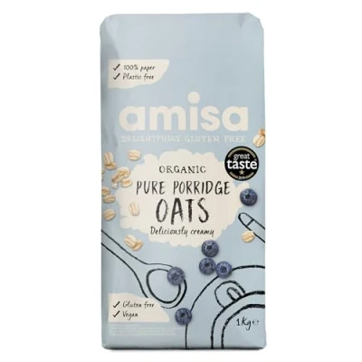 ORGANIC GLUTEN-FREE WHOLEGRAIN OATS: Enjoy the natural goodness of Amisa Pure Wholegrain Oats, certified organic and batch tested for gluten using the ELISA method. HIGH IN SOLUBLE FIBRE: These gluten-free oats are an excellent source of soluble fibre, helping to keep you feeling full for longer and supporting healthy digestion. VERSATILE AND NUTRITIOUS: Perfect for a warming bowl of porridge or adding to your favourite bakes, these oats offer a delicious and healthy start to your day. GREAT TASTE AWARD WINNER: Recognised for their exceptional flavour, these oats come packed in fully recyclable paper packaging, making them a sustainable choice for your pantry. EXPLORE OUR ORGANIC BREAKFAST RANGE: Love oats? Try our Apple Cinnamon Oats, Four Grain Porridge, and Fruity Oat Muesli—all certified organic and batch tested for gluten.