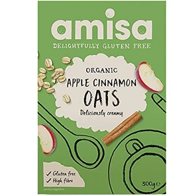 Amisa Organic Gluten Free Pure Porridge Oats Apple & Cinnamon, 300g High in Fibre The Perfect Breakfast Cereal