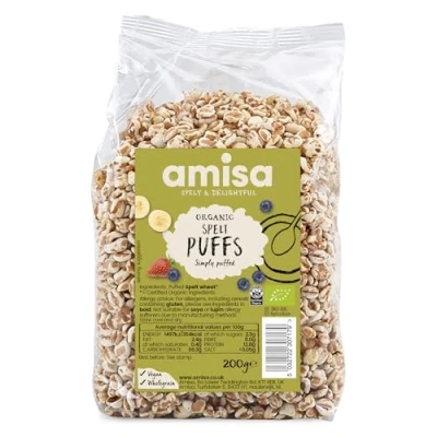 Amisa Organic Spelt Puffs, 200g Light & Crunchy Texture High in Fibre Vegan Friendly Cereal