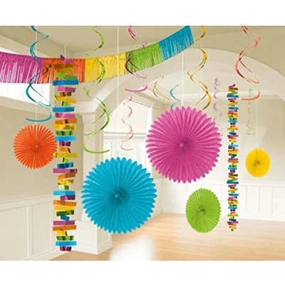 Package includes: 3 multicolor fans (20cm), 2 fans (40cm), 10 swirls (55cm), 2 strings (200cm), 1 fringe banner (270cm) Featuring a decorating kit in multicolor theme with fringe banner decoration, paper fans, hanging swirls, and string decoration. Use this string decorating kit to create a stunning look for your party event. Add festive shimmer to a wedding, bridal shower, anniversary party, graduation party, New Year's Eve party, Christmas party, or other holiday event. Match it with other birthday party supplies and decorations., Manufacturer: Amscan