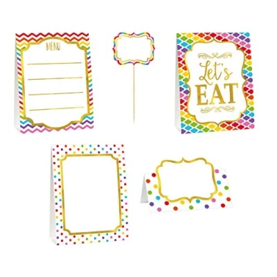 Package includes: 3 x small tent cards 10cm x 7.5cm, 3 x large tent cards 17cm x 16cm, 6 x picks 18cm Product features a rainbow color scheme with chevron, Moroccan, and polka dot designs. Perfect for birthdays, showers, anniversaries, beach parties and many other events. Made of paper, Manufacturer: amscan