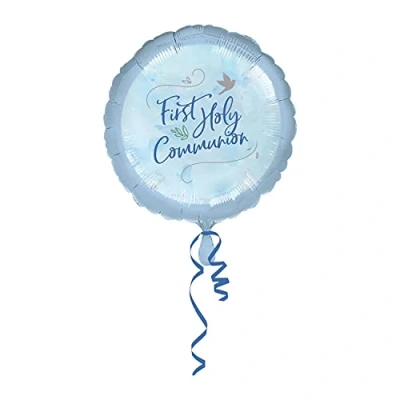 Beautiful blue party supplies perfect for their First Holy Communion. Blue, round foil balloon with gold dove detailing and a 'First Holy Communion' message. Simply pair with complimentary foil balloons to create a stunning balloon bouquet. Measures: 18" Suitable for helium inflation only, Manufacturer: Amscan