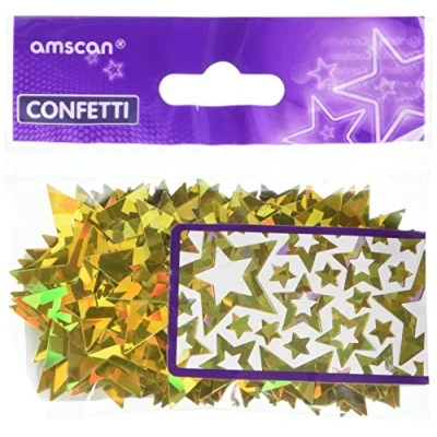 Package includes 1 pack Prismatic Gold Stars Confetti. This product brings added color to your celebration. Features gold metallic foil confetti with prismatic star hollow cut-outs in a variety of sizes. This confetti can be placed on tabletops or centerpieces to add sparkle and accent to your celebrations. This product is made of high quality foil materials and weighs 14 grams in each pack.