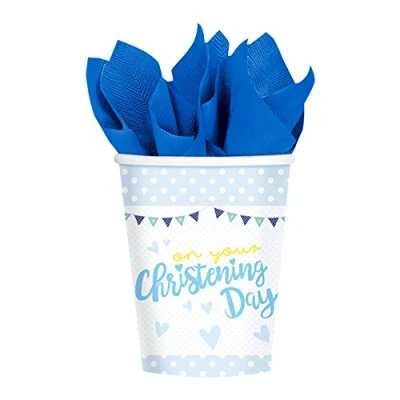 Package includes 8 x cups 266ml Product features a pretty pattern of blue and white polka dots bunting and the words ‘on your Christening Day’ Perfect for Christening parties Made of paper, Manufacturer: amscan