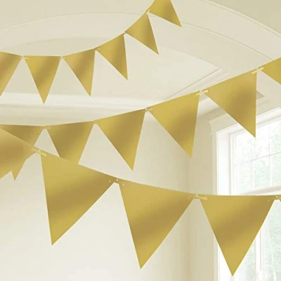 Package includes 1 Pennant Banner. This Plastic Pennant Banner adds more fun and color to your celebration. This product features gold colored plastic pennants connected together to create a beautiful banner. Hang this pennant banner on the walls or along the stair railing. Best used for Themed Celebrations. This product is made of quality plastic and measures 21cm wide x 30cm drop triangle pennants.