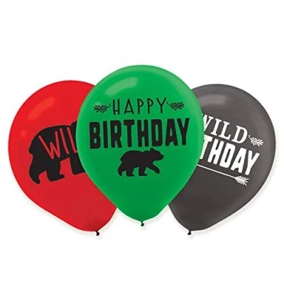 Product includes: 6 x balloons 28cm Product features red, green, and black colors and “Happy Birthday”, “Wild Birthday”, and “Wild” headlines with printed bear cub silhouettes on it. Perfect for birthdays. Made of latex, Manufacturer: amscan